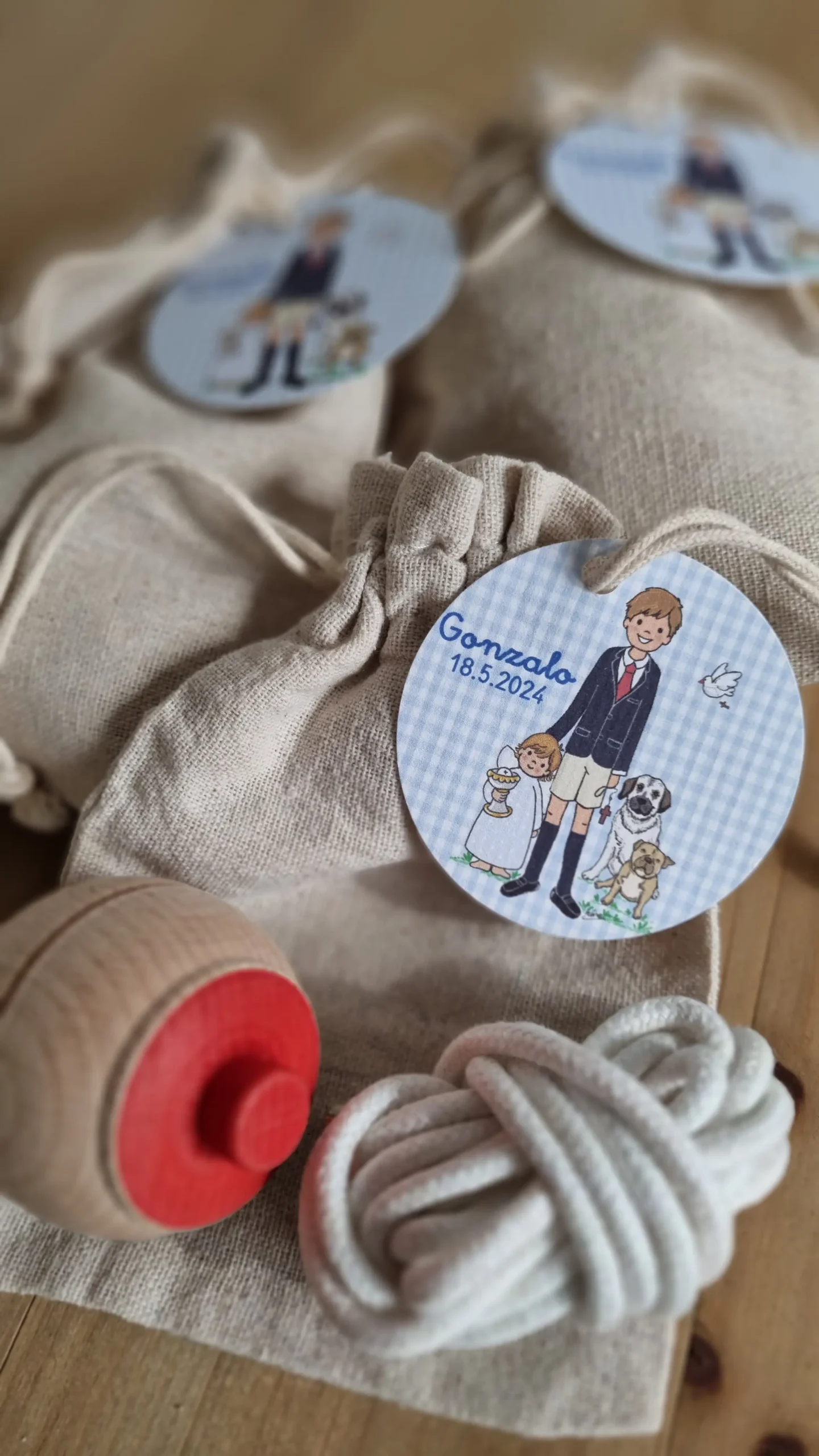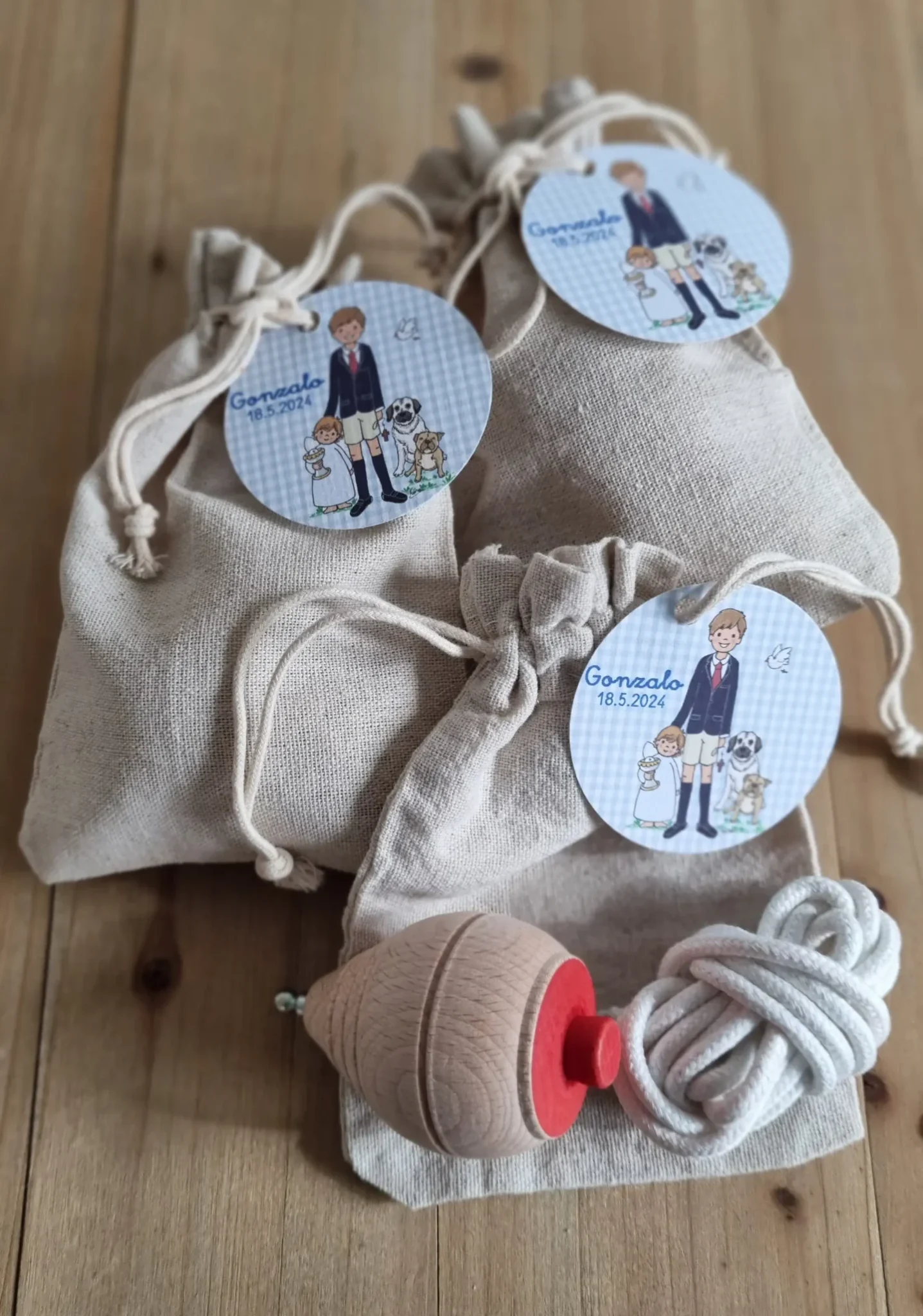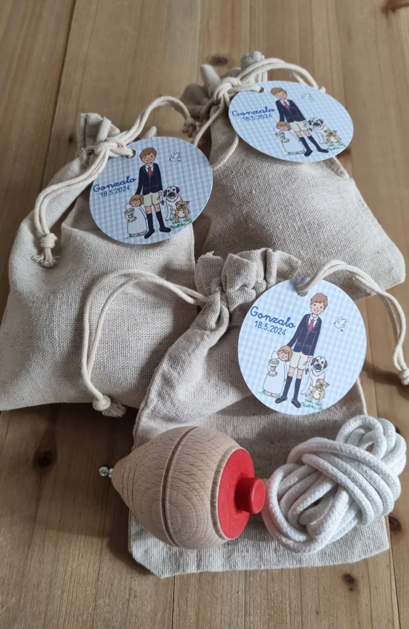 Bolsas de yute con una tradicional peonza de madera.